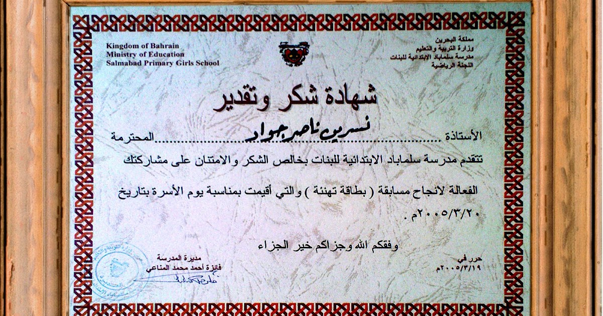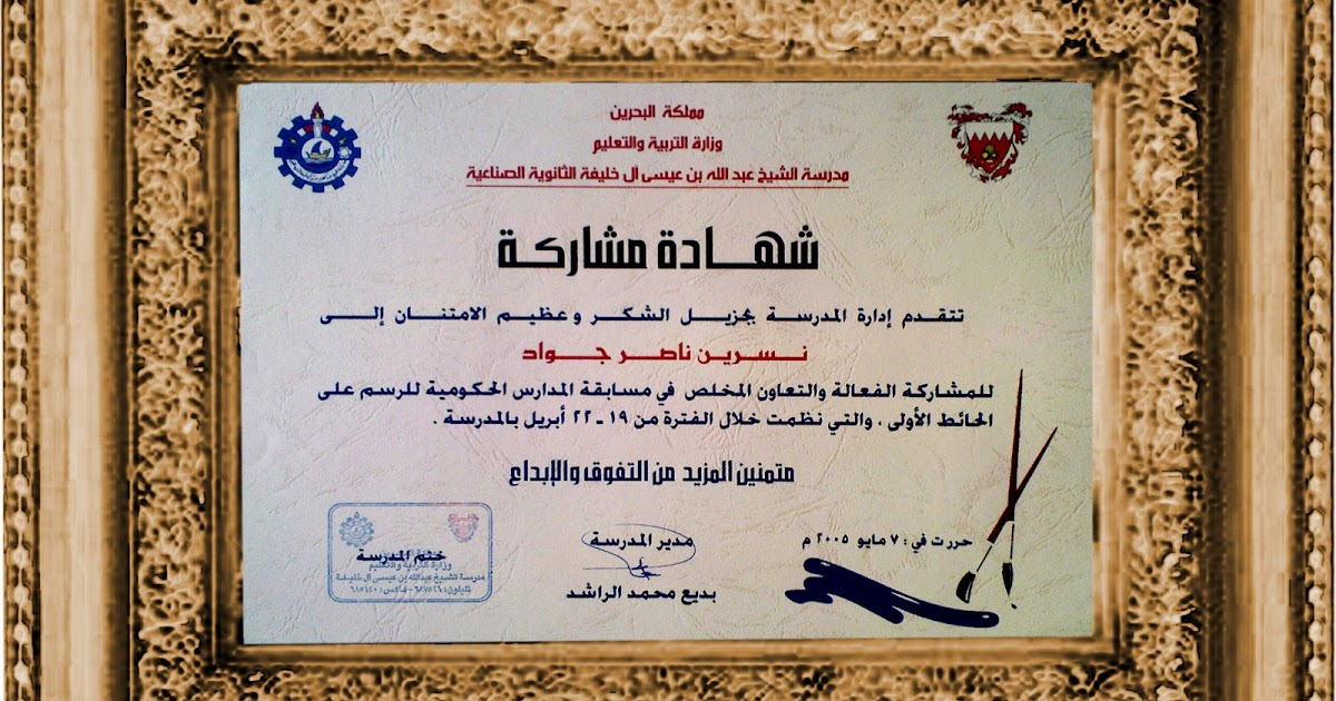 نسرين جاليري شهادة شكروتقدير للمشاركة في مسابقة بطاقة تهنئة 2005