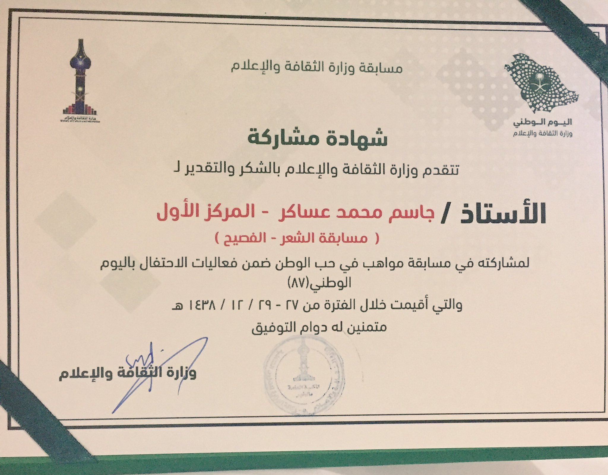 جاسم عساكر Twitterren شهادة تكريم الفائز بالمركز الأول بالمنطقة الشرقية في مسابقة وزارة الثقافة عن اليوم الوطني كل عام و الأخضر لا يكف عن الرفيف Https T Co Cfzyhhuyvy