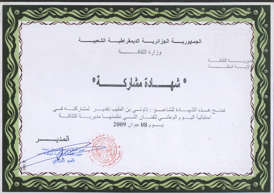 المرحوم تاوتي بن طيب شهادة مشاركة في اليوم الوطني للفنان