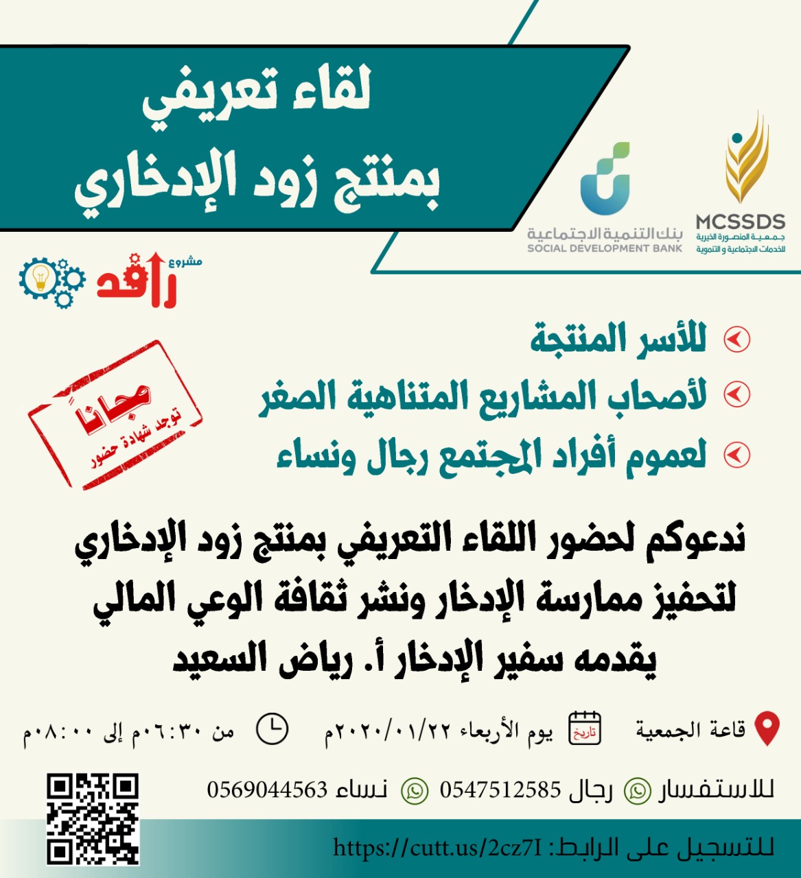 جمعية ا لـ مـ نـ صـ و ر ة الخيرية على تويتر دعوة للجنسين لحضور اللقاء التعريفي بمنتج زود الادخاري بالتعاون مع Sdb Sa يقدمه سفير الادخار أ رياض السعيد في جمعية المنصورة